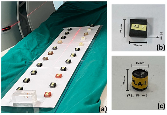 The printed cubic samples and the cylindrical pellet (melted) samples were CT scanned at Saint Marina University Hospital of Varna using a Siemens SOMATOM Definition scanner (Figure 2a). They were divided into two groups. The first group (Figure 3a,b) included all the materials without metallic components (ABS-S, ABS-G, PEG-PP, PLA-WC, ASA-A, TPU-P, TPC-F, BVOH, PLA-C, ABS-E, PLA-CC, PETG-C, PLA-CC, PLA-XT, ABS-CE, PLA-E, PETG-HD, PLA-S, ABS-SB10, ABS-SB20, ABS-CSH, PLA-SSB). The second group of samples (Figure 4a,b) included all the materials with metallic components (PLA-I, PLA-MC, ABS-C, PLA-G, PLA-ST, REFL).