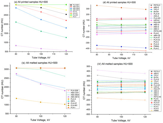 Average CT number for 29 materials studied as (a,a′) printed samples, and (b,b′) melted samples. Measurements were taken at 80 kV, 100 kV and 120 kV. A block of PMMA was scanned as a reference material [48].