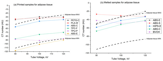For melted samples, at 120 kV, Figure 6 shows that HIPS-E, ABS-E, ABS-C, ABS-S and BVOH, are suitable materials for mimicking adipose tissue, with average CT numbers of—32 ± 2 HU, −20 ± 4 HU, −41 ± 12 HU, −32 ± 2 HU, and −43 ± 24 HU, respectively. For 3D printed samples at 120 kV, ABS-E, ABS-C, PLA-W, TPU-P, and TPC-F suitably mimic adipose tissue. The CT numbers of all these materials were within the range of minimum/maximum HU values for adipose tissue of bovine and porcine samples, as reported by Ma et al. [20].