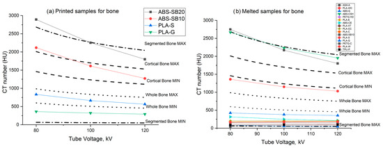 For melted samples at 120 kV, no material was found to be suitable for mimicking cortical bone or whole bone. However, for bone tissue segmented from animal CT scans [20], with CT numbers ranging from +50 HU to +2042 HU, our data for 3D printed samples at 120 kV showed that PETG-C, PLA-W, TPU-P, ASA-A, PLA-WC, ABS-G, ABS-CSH, ABS-SB10, PLA-S, PETG-HD, PLA-E, ABS-CE, PLA-XT, PLA-CC, PLA-C, and PLA-G are suitable substitutes for segmented bone tissue samples.