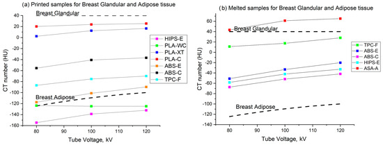 Measured CT numbers of printed (a) and melted samples (b) for selected materials whose attenuation is close to that of breast adipose tissue and breast glandular tissue at 80 kV, 100 kV, and 120 kV. The dashed lines indicate the CT number for adipose breast tissue (−100 HU at 120 kV) and fibroglandular breast tissue (+40 HU) as referenced from Ruschin et al. [49]. For the energy dependence of breast adipose tissue, we assumed the trend of adipose tissue reported by Ma et al. [20].