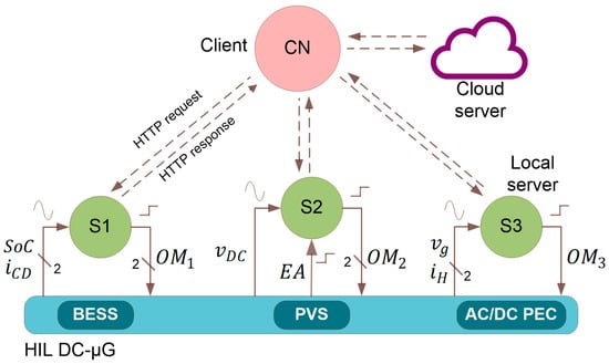 To recover the measured variables from the DC-µG and to update the OM on each element of the DC-µG, the CN interacts directly with each LS by using HTTP requests. In the case of S1, it is associated with the BESS through two analogic signals and two digital outputs. With the analogic signals, S1 receives information related to the SoC of the battery bank and the extracted/injected current to the bus by the BESS (). The digital outputs allow S1 to modify the operative mode of the BESS. The PVS is monitored by S2 through an analogic input to measure the voltage present in the DC bus. Also, the PVS uses the digital signal to communicate the availability of energy from the PV. Similarly to S1, the operative mode of the PVS is modified with two digital outputs from S2. The final LS, i.e., S3, was connected to the bidirectional AC/DC PEC with a set of two analogic signals and one digital signal. One of the analogic signals is used to report the MG voltage (), while the other corresponds to the extracted/injected current to the bus (). Lastly, the OM of the PEC is modified by S3 with the digital signal. It is important to mention that not all of the LSs compute control actions, because their functions are restricted to measure variables from the DC-µG and to send these measurements to the CN. Later, the LS receives the adequate OM from the CN to be codified, and the OM is communicated to the LC afterwards. The complete communication process, including the order of sequences and the information flow, is described in the following section.