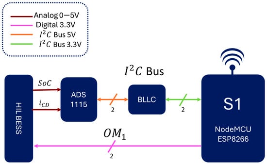 The CN and the set of LSs were created with a NodeMCU ESP8266 development board, which has the capability of connecting to a Wi-Fi network. Particularly, the digital input/outputs of this board work in a range from 0 to 3.3 V, and the board has only one ADC with a conversion range from 0 to 1 V. For these reasons, the use of the board required some adaptions to be coupled to the HIL platform, including the attachment of a bidirectional logic level converter (BLLC) to couple an ADS1115 module (4-channel ADC with a 16-bit resolution). In Figure 5 can be seen an example of the interconnection of these elements for the slave node S1. The ADS1115 can be used to perform the measurement of four single-ended voltage signals or two differential signals; the module works with an I2C communication protocol. Although the LSs are supposed to be WSns too, the LSs used in this work do not include sensors since the HIL platform used to emulate the DC-µG also emulates the sensors.