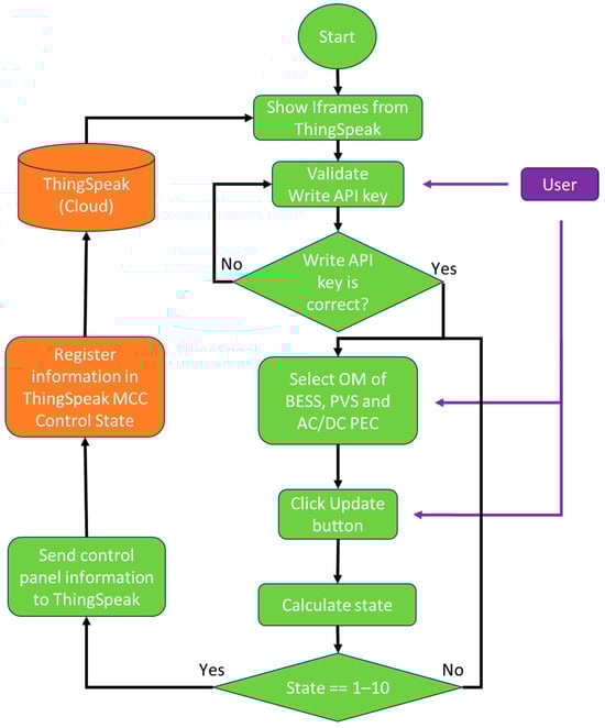 The UWA interface for this work was designed to provide the user with elements of control and indicators. Among the elements of control, a text box was included to introduce a write API key for the MCC. This key adds security to the IoT-based EMS by preventing an improper usage by unauthorized users. Also, the controls include ad hoc drop-down menus for the OM of each element contained in the DC-µG. This setting allows the user to easily select between a manual control or an automatic control. The indicators present the uploaded variables (, , , , and ) to the server in a graphical format, allowing the user to supervise the evolution of the DC-µG to perform a better management of the grid. The flowchart related to the functioning of the UWA, including its interaction with both the cloud server and the user, can be seen in Figure 7. As a first step, the UWA displays the time-series plots of the stored variables in ThingSpeak by using Iframes. Next, the write API key is verified to enable/disable the user controls. When the user has logged in with a valid key and selected an OM for each system with the aid of the menus, the UWA will take these selected OMs as a combination to compare it with a valid state from the FSM (see Table 1). If the combination matches with a valid state of the FSM, then a codified number from 1 to 9 is sent to the MCC in ThingSpeak; otherwise, the UWA does not send any number to ThingSpeak. In the case of an automatic mode selection, the UWA sends the state numbered as 10 to the MCC.