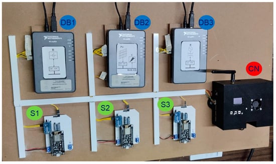 In this section, the reader can find the achieved results in the development and evaluation of the IoT-EMS-WSAN. As shown in Figure 8, the DC-µG HIL was created with the interconnection of three NI MyRIO 1900 development boards (DB1 to DB3); meanwhile, the WSAN consisted of three LSs (S1 to S3) and a CN, which were developed with a set of NodeMCU boards. Each DB not only was responsible for emulating an LC but also for emulating the behavior of the systems allocated in the DC-µG, such as the BESS in the case of DB1, the PVS and the DC bus in the case of DB2, and the bidirectional AC/DC PEC and MG in the case of DB3.