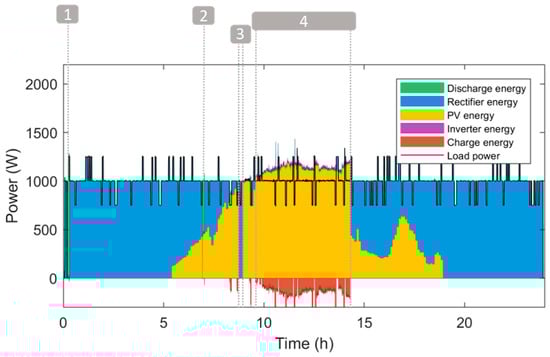 As shown in Figure 9, the initialization of the DC-µG not only started to cover the energy demanded by the DC load with the MG (AC/DC PEC operating as rectifier), but it also did not include the PV system to satisfy this demand. After this initialization, the DC-µG went through four special operating conditions, which are numbered from 1 to 4 in Figure 9. During the first condition (event 1), an outage was generated from the MG at sample 100, and the EMS responded by setting the BESS to supply the DC load with the stored energy in the battery bank; the event is marked with a change from a blue to a green color in Figure 9. The next condition (event 2) was present from sample 1800 to sample 2800. The event was characterized by an energy surplus delivered by the PVS to satisfy the demand of the DC load. Therefore, the EMS responds by charging the battery bank (BESS set with a charging OM) with this surplus. In fact, this energy surplus delivered by the PVS (yellow area above the load power line in Figure 9) matches the energy used to charge the battery bank in the same period (red area below the 0 W line in Figure 9). While the second event was still present, an outage was induced from the PVS (event 3), which started at sample 2225. To rectify this condition, the EMS not only suspends the charging process for the battery bank, but also takes the required energy from the MG to satisfy the demanded energy by the DC load. Lastly, an outage was induced from the MG at sample 2800 (event 4); here, the BESS accompanied the PVS with the battery bank to satisfy the demanded energy by the DC load.