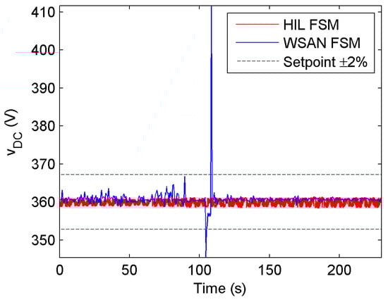 DC voltage bus response to the implemented HIL and WSAN Finite-State Machines.