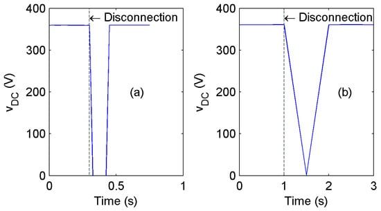 DC bus voltage response under a source disconnection: (a) with the FSM implemented in the HIL platform PC and (b) with the FSM implemented in the WSAN.
