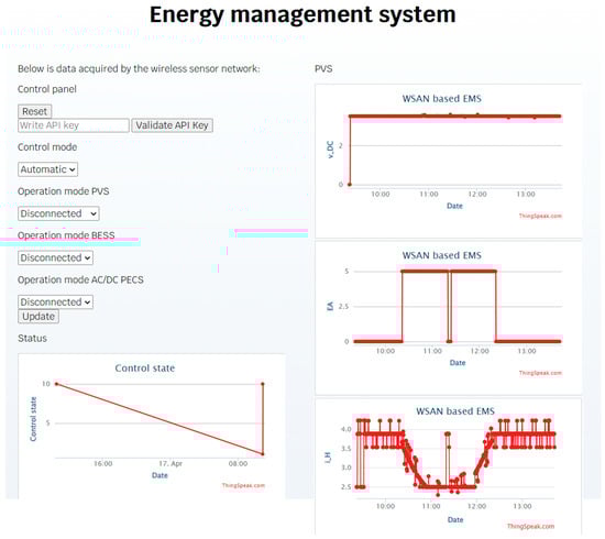 Thus, in the first case, ThingSpeak will respond to the HGR with the state “10” of the FSM—albeit, the FSM only has 9 states—to operate under an automatic scheme where the FSM determines the OM for the systems in the DC-µG. After selecting the automatic mode, the CN sends an HGR separately to each LS to request for a measurement of its respective variables (, , , , and ). Based on the collected measurements, the CN computes the next state in the FSM to define the corresponding OM for each LS by sending a new HGR separately. Consequently, the DC-µG goes by different operative modes after each LS modifies or maintains the values from its digital outputs. In each cycle, the CN verifies the elapsed time since its last connection with ThingSpeak. If the elapsed time is at least 16 s, then the CN uploads information to the server, referring to a pair of HGRs. Otherwise, the CN keeps a routine of measuring variables from the DC-µG, calculating the next state in the FSM and updating the OM of the µG elements. When the CN is uploading data to ThingSpeak, in the first HGR is sent the established state by the FSM, which is saved in a channel named status channel (SC). The second HGR uploads the measurements made by the WSAN from the DC-µG; these measurements are saved in a six-field channel called the variables channel (VC).