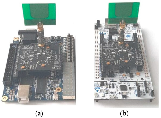 Ranging network nodes: (a) a UWB chaotic radio pulse emitter node on the FPGA prototyping board DE10-Lite and (b) the chaotic radio pulse receiver node on the STM32 Nucleo-F746ZG prototyping board.