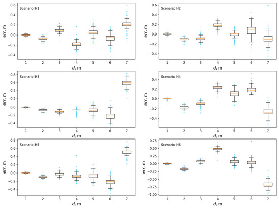 Distance measurement error versus distance for scenarios H1–H6. Orange—median value, rectangle—interquartile interval, blue—outliers.