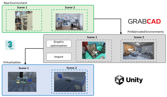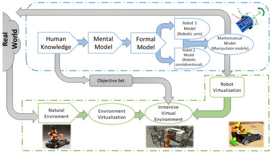Simultaneously, it creates an environment that adapts to real-world demands and leverages contextualized human knowledge. This environment is designed to host multiple tasks or objectives that require system intervention. Subsequently, we carry out the virtualization of this defined environment through the use of CAD software and graphics engines, with the purpose of familiarizing the user and facilitating clarity in the learning process. A schematic of the conceptualisation process involved is presented in the Figure 2.