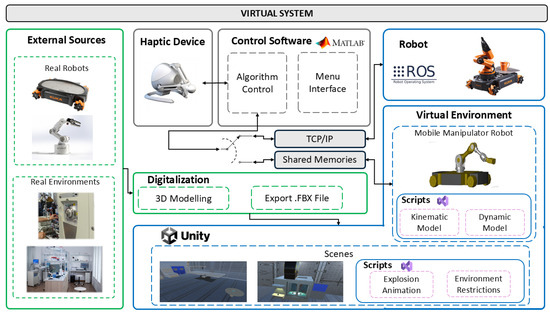 Therefore, the virtual system designed in the Unity graphic engine includes a mobile manipulator robot, previously modelled in CAD software, with an environment composed of two predefined scenes, based on external resources of the real robot and for the simulation scenarios. The CAD software used is Solid Works 2019.Through a formal mathematical model, which incorporates the kinematics and dynamics of the robotic system, the animations of the robot’s movements are generated by means of scripts integrated in the graphic engine. In addition, control algorithms are developed in MATLAB, which allow the execution of the necessary actions to accomplish the tasks desired by the user. These actions are commanded through the Novint Falcon haptic device, which is connected to the control software. The communication between the control software and the graphics engine is done through a Dynamic-Link Libraries (DLL). Where, MATLAB software sends the control actions to Unity and receives the information from the robot. On the other hand, control actions can also be transmitted to a real robot, using a TCP/IP wireless communication protocol, which allows virtual tasks to be replicated in a physical environment, making it possible to evaluate the controller to remotely control the robot experimentally and also design an autonomous controller for the robot to perform a defined task.