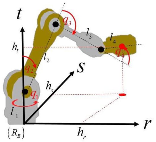 Now, taking the fixed reference system ; and the number of independent arm joints is four, i.e., a 4DOF anthropomorphic robotic arm, (see Figure 4). The position and orientation of the robotic arm is determined: