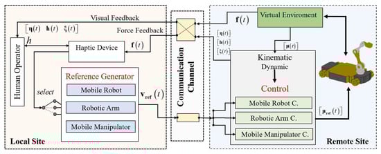 The teleoperation scheme allows to command any robot over long distances, i.e., it allows to operate the robot to perform a specific task by the human operator (Figure 6). The defined task usually consists of several operation processes, and these commonly include three stages: (i) approach; (ii) manipulation; and (iii) return process. When the mission is initiated, the human operator must move the mobile robot manipulator close to the object, the robotic arm should be considered to be within its working space. Once the mobile robot reaches the proximity of the target object, the human operator switches the locomotion mode to manipulation mode (control of the robotic arm). When the manipulation mission is completed, the human operator switches the manipulation mode back to locomotion mode and the mobile manipulator robot shall return to a safe area. To accomplish this task, the teleoperation scheme proposed for this work is presented in Figure 7.