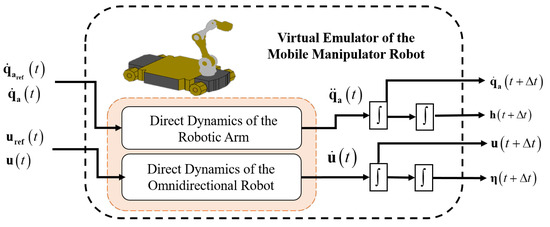 The dynamic model is a mathematical formulation that describes the dynamic behaviour of a system. It establishes the relationships between the robot’s joint coordinates or coordinates of interest, velocities, accelerations, forces and torques applied at its joints and the robot’s parameters, such as masses and moments of inertia. The model used in this work is a simplified [23] model, this model is represented in terms of reference velocities, because it is easier to apply velocities than torques, as in traditional robot models. Therefore, to emulate the dynamics of the robot, the direct dynamic model of the robot is used. For this purpose, the inverse dynamic model is used. Now, the direct dynamic model used in this work is defined by: