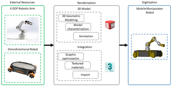 In order to carry out the digitalization process of the mobile manipulator robot, it is necessary to take external resources as a reference. As shown in the diagram above (Figure 9), a 4 DOF robot arm is used for the manipulation of an object in question, while a KUKA omnidirectional robot is used as a reference for the movement of the robot [24]. Then, using CAD software, a 3D solid object is modelled for each of the robots, with the necessary physics for their respective movements and constraints in order to develop the required animation. Once the CAD design of the two robots has been completed, it is exported to Autodesk 3DS-Max 2024 software, which allows the design to be rendered, dimension and rotation changes to be made, and exported in the format required for the graphics engine. In addition, the rotation axes of each joint of the robotic arm are configured and the centre of the axis of the mobile robot is established during the animation phase. At this stage, the movement of each joint and of the platform is checked to ensure that it matches the axes of movement of the real robots. Each component of the robot can then be exported separately to the graphics engine, as each part has its own animation and movement, determined by the kinematic and dynamic model through script programming.