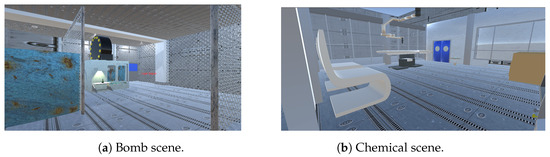 Once the export and rendering of the prefabricated scenarios in the Unity graphic engine is completed, we proceed to add the attributes, materials and physical properties to each of the elements present. In this project, two main scenarios have been developed. The first is an environment dedicated to the handling of explosives, where a grenade has been placed near a machine; in this case, the object of interest is the bomb. The second scenario represents a laboratory for handling chemicals, with a flask filled with an explosive liquid as the main object, as shown in the graphic above (Figure 11).