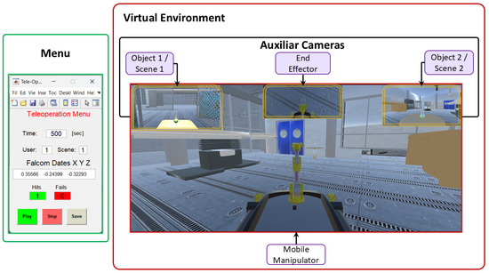 To enable navigation through the environment by moving the mobile manipulator robot, a visual interface has been developed and is shown in the figure (Figure 12). This interface presents the virtual environment from the perspective of the manipulator robot as the main screen, providing an overview of the operating area. Additionally, three auxiliary cameras have been incorporated to provide different perspectives crucial to the task. One of these auxiliary cameras provides a detailed view of the operating end, which is essential for precise manipulations. The other two cameras focus on the objects of interest in each scene, allowing a clear visualization of the target elements to be manipulated. This multi-camera setup ensures that the user has a complete understanding of the environment in order to monitor and control the robot, thus improving efficiency and accuracy in task execution. According to the type of task to be performed, whether it is locomotion or object manipulation by the mobile manipulator robot, the control law is selected by means of the Novint Falcon device, as described in Section 3.2. Additionally, for the movement of the end-effector, there are different types of sensors that help this movement, such as force, optical or piezo-resistive sensors, but for this application, by means of the haptic device, an on/off switching of the gripper is generated, which grips the object as long as it is close to the target.