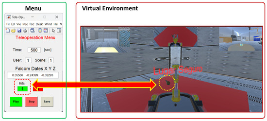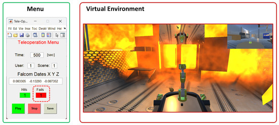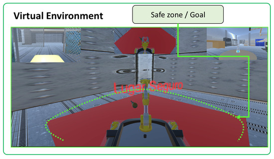 As mentioned above, the goal of the teaching-learning system is to transport an object of interest to a safe location using the mobile manipulator robot. This safe place is located outside the two main scenes, and is where the dangerous object should be deposited. If the task is performed successfully, the menu increases the number of successes; otherwise, the number of failures is increased (view Figure 13). Otherwise, if the object of interest falls in an area outside the safe area or contacts any other part of the environment, such as walls, machines or other objects present in the scenes, the number of failures is increased.