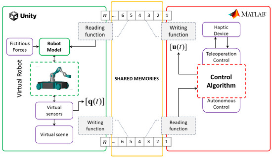 Finally, once the virtualization of the scenarios and objects in the graphics engine has been completed and the control algorithms have been established in MATLAB, a bilateral communication channel known as Shared Memories is used to facilitate the exchange of information between the virtual environment and the MATLAB mathematical software, using a Dynamic Link Library (DLL) that creates a shared memory in RAM (SM) for the exchange of data between different programs [25].Through the SM, the control actions calculated in the target controller are integrated into the mathematical model of the robotic system. This model calculates the position and velocity outputs, which are then sent to the mathematical software, thus closing the control loop by providing feedback on the robot’s output states. The desired task can be selected by the haptic device, or in the case of using an autonomous control, the user can define the desired task to be performed, e.g., positioning, trajectory tracking or path following, where the computation of the control algorithms is performed by MATLAB mathematical software [21]. Subsequently, the references generated by the controllers are applied to the robot. The Figure 14 indicates the communication scheme used for bilateral communication.