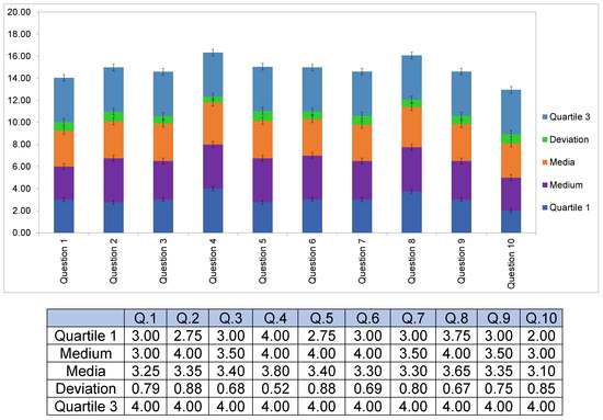 The usability evaluation data, illustrated in the figure above (Figure 18), provide detailed insight into how users perceive the teaching-learning tool. The error bars in the figure show the variability of responses among students, indicating the range within which the responses of the rest of the population fall.