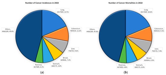 Total number and proportion of cancer (a) incidences and (b) mortalities in 2022 (data taken from [1]).