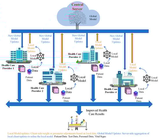 Figure 2 illustrates a federated learning model where multiple healthcare providers collaborate to train a shared machine learning model without sharing patient data directly. Each healthcare provider trains its local model using its own data, and only the model updates are sent to a central server. The central server aggregates these updates to create a global model, which is then shared back with all the healthcare providers, who then continue to refine the global model by performing further training with their local data, and this iterative process continues until the model is fully trained. By collaborating and sharing data, organizations can unlock the potential for groundbreaking advancements in our current understanding of diseases and treatments.