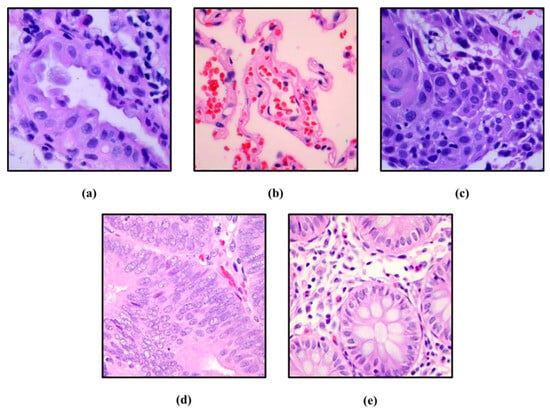 Histopathological images from LC25000 dataset where (a) lung adenocarcinoma; (b) lung benign; (c) lung squamous cell carcinoma; (d) colon adenocarcinoma; and (e) colon benign.