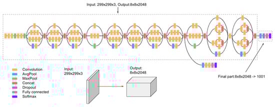 The primary technological advancement of Inception-V3 lies within its inception modules, which encompass various building blocks, such as convolutions, average pooling, max pooling, concatenations, dropouts, and fully connected layers. Figure 7 represents the architecture of Inception-V3. The architecture is composed of multiple modules, including convolutional layers, pooling layers, and inception modules that combine various filter sizes (e.g., 1 × 1, 3 × 3, and 5 × 5) to capture different types of image features. The model extensively utilizes batch normalization, which is applied to activation inputs. The computation of loss involves the utilization of Softmax. The Inception-V3 model also includes the integration of global average pooling, a technique that replaces the conventional fully connected layers located at the final stage of the network. By reducing overfitting and parameterizing the model size, the efficiency of the system is enhanced and its adaptability to new tasks is improved.