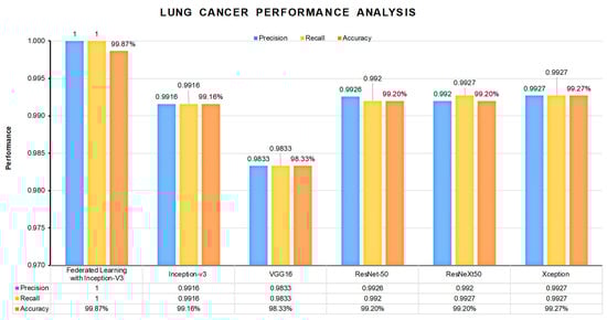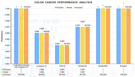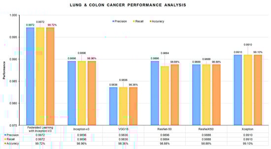 The proposed federated learning approach with the Inception-V3 model to classify lung and colon histopathological images yielded a significant outcome in accurately distinguishing between three subtypes of lung cancer and two subtypes of colon cancer from histopathological images. The model demonstrated a remarkable accuracy of 99.720%, as well as a recall, a precision, and an F1 score of 99.720%. The detection of colon cancer achieved 100% accuracy in classifying both classes. The accuracy of lung cancer classification for the three classes was 99.867%. This proves that the proposed federated learning methodology can effectively guarantee adherence to regulations while dealing with patient data and precisely categorizing cancer cells with great accuracy.