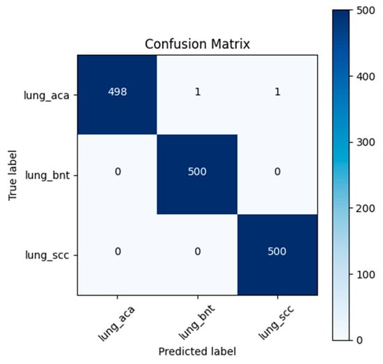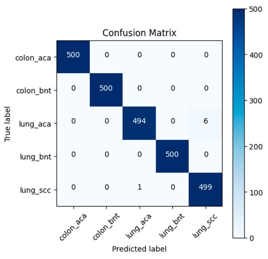 One study [13] discussed the use of histogram equalization as a preprocessing step, followed by the application of pretrained AlexNet, to improve the classification of lung and colon cancers. Toğaçar et al. [14] utilized a pretrained DarkNet-19 in conjunction with support vector machine classifiers to attain a 99.69% accuracy rate in their study. Using DenseNet-121 and RF classifiers, Kumar et al. [15] achieved a 98.6% accuracy rate in their classification. Another study utilized feature extraction and ensemble learning techniques, along with the incorporation of high-performance filtering, to attain an impressive accuracy rate of 99.3% when using LC25000 data [16]. The use of artificial neural networks (ANNs) with merged features from the VGG-19 and GoogLeNet models was covered in [17]. The ANN achieved an accuracy of 99.64% when the fusion features of VGG-19 and the handcrafted features were combined. In a separate study, the authors employed a convolutional neural network (CNN) with a SoftMax classifier, which they named AdenoCanNet [18]. The accuracy of the entire LC25000 dataset was 99.00%.