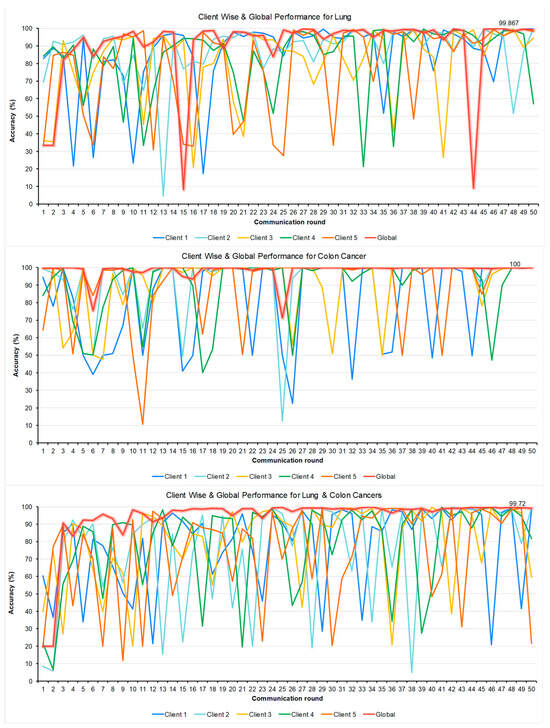 - The federated learning workflow was streamlined for smooth global model updates after each communication round, with local model weights adjusted to align with the global model. A comprehensive evaluation process was also applied, assessing each client’s model performance after every training epoch, enhancing transparency and identifying performance variations or underperforming clients.