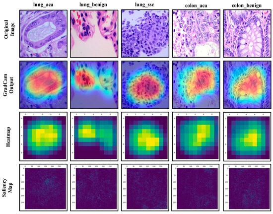 The dataset LC25000, published in 2020 by A. Borkowski and colleagues [32], was utilized in this study. The collection contains images of lung and colon tissues, which are categorized into five distinct classes. There are three distinct types of lung tissue images: adenocarcinoma, squamous cell carcinoma, and benign. Some sample images of the classes can be seen in Figure 5. The production of this content was made possible through the provision of resources and utilization of facilities at James A. Haley Veterans’ Hospital. It is collected from patients through keen observation by physiologists.