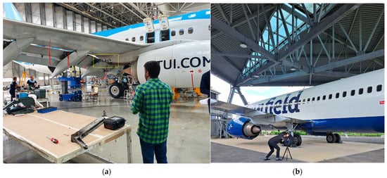 The development of the dataset was a pivotal aspect of the project and could not have been achieved without the support of the project partner, TUI’s Group Base maintenance hangar in Luton airport. The requirement was to find images of aircraft skin, including various types of defects, focusing on dents. The only way to access these sources was through a maintenance, repair, and overhaul (MRO) facility, which the partner facilitated. Cranfield University researchers frequently visited the hangar during the project, capturing different yearly maintenance cycles (Figure 1). On every visit, the team was flying inside the hangar a Commercial-Off-The-Shelf (COTS) drone, Parrot Anafi (Parrot Drones S.A.S., Paris, France), outfitted with a camera on an integrated gimbal capturing 4 K footage and 21 MP stills. To complement the procedure in places underneath the fuselage or in dangerous and crowded places (e.g., close to scaffolds), a handheld camera was used, GoPro Hero 11 (GoPro, Inc., San Mateo, CA, USA), with the ability to capture 27.6 MP still photos in linear mode to eliminate barrel distortion. Complementary, whenever there was a good reason for that, and a team member was unavailable to capture it, maintenance engineers used their mobile phones and shared the images on the next visit. These images were also included, as they do not negatively affect the consistency of the image acquisition source; instead, they will increase the versatility of the suggested solution. The suggested solution targets indoor environments such as hangars, where factors such as different illumination conditions due to the time of the day and weather do not affect the performance of the solution.