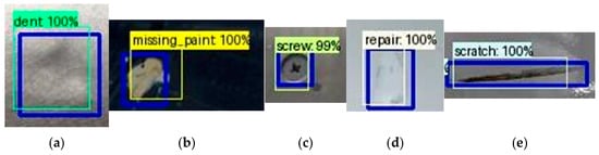 These are the five different classes that are considered in the approach: (a) dent; (b) missing paint; (c) screw; (d) repair, and (e) scratch.