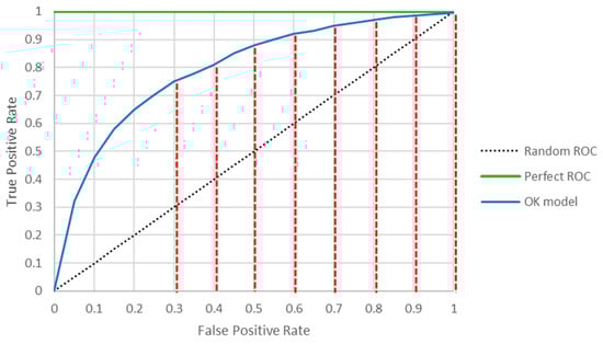 The ROC graph, as depicted in Figure 3, serves as a standard tool for assessing the performance of the models. In every ROC graph, the reference point is the random diagonal ROC line, representing a model that predicts classes with equal probability. Anything below this line signifies inefficiency in classification. In an ideal scenario where the model makes all predictions correctly, the ROC curve resembles the one depicted in green. In this case, the FPR consistently remains at 0, while the TPR remains at 1.0. However, the ROC curve typically falls between these two extreme cases, as represented by the blue curve. The AUC of the ROC curve is a single value used to evaluate the model’s performance. It quantifies the model’s ability to distinguish between classes across all possible thresholds.