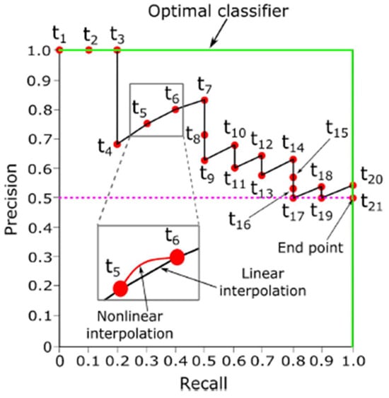 The PR curve aligns with the rationale of the ROC Curve. However, recall is plotted on the x-axis in the PR curve, while precision is on the y-axis. Unlike the ROC curve, which accounts for TN values, the PR curve focuses solely on TP, FP, and FN values. This distinction renders the PR curve particularly valuable in scenarios with class imbalances, offering insights into precision–recall trade-offs across various IoU thresholds. Figure 5 shows an illustrative example of a PR curve. It often presents as a zigzag pattern and may intersect itself. The green line denotes ideal classification performance, achieving 100% precision and recall, while the purple line represents the baseline. Any points below the baseline signify inefficiency in classification.