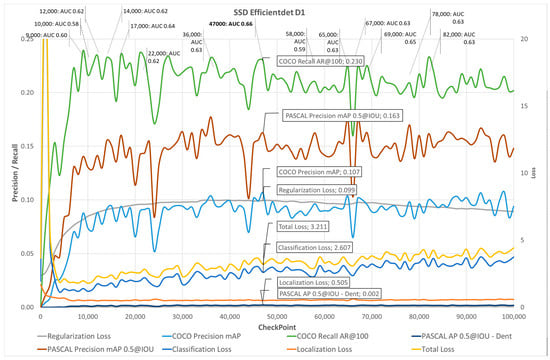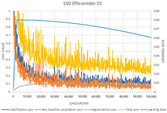 Figure 7 illustrates the training performance of the SSD Efficientdet D1 model. The left Y-axis represents the loss metrics, while the right Y-axis denotes the learning rate. The X-axis spans from 0 to 100,000 steps, covering the training duration. Initially, the learning rate was set at a conservative value of 0.001 and gradually increased (warm-up phase) to the target value of 0.08. This technique of gradual adjustment aids in smoother optimisation, which is advantageous for complex datasets. As the training proceeds, the learning rate stabilises briefly before entering the descending phase, a common strategy to fine-tune model parameters and enhance convergence. At the same time, it can be noticed that the classification loss, localisation loss, and total loss exhibit a descending trend with fluctuations of up to 50,000 steps, indicative of the model’s learning process. The stabilisation, after that, signifies the optimisation and attainment of its potential capabilities. Regularization Loss, which is crucial for understanding generalisation, initially increased as the model learns from data, promoting better generalisation and mitigating overfitting. Following the same logic, it was stabilised as the model optimised its parameters and gradually decreased towards the training’s conclusion, reflecting convergence. Figure 7 shows that the SSD Efficientdet D1 model demonstrates a solid generalisation ability.