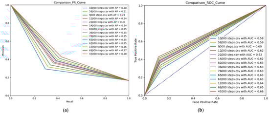 The PR metric is another critical tool for evaluating model performance, particularly in scenarios characterised by class imbalance. Precision is a measure of result relevancy, thereby emphasising the accuracy of the model’s predictions. In contrast, recall measures the ability of the model to capture all relevant instances, reflecting the completeness of the retrieval process. Together, precision and recall offer valuable insights into the effectiveness of predictive models. These metrics are calculated based on the Equations (3) and (4):