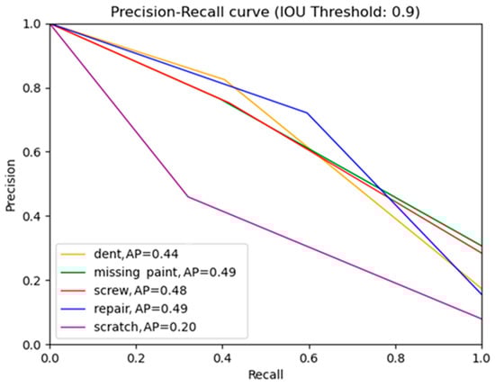 The previous section’s comparison analysis shows that the best-performing model is the Efficientdet d1. For this model, the resolution of the presented analysis will be increased, going deeper and understanding the behaviour of the model for the different types of artefacts. A precision–recall curve was generated using a stringent IOU threshold set at 0.9 to achieve this. As depicted in Figure 11, both the precision and recall axes range from 0 to 1. Notably, the class exhibiting the best performance is missing paint and repair, with an average precision (AP) of 0.49, while dent ranks fourth, boasting an AP of 0.44. This performance discrepancy can be attributed to missing paint and screws, which are classes with a higher number of annotations compared to dents, repairs, and scratches. To enhance precision and recall scores, augmenting the sample size for the underrepresented classes is imperative. An additional reason that justifies this behaviour is that repairs and screws carry significantly more visual information compared to a dent (e.g., a screw has the characteristic shape of a circle with a cross in the centre).