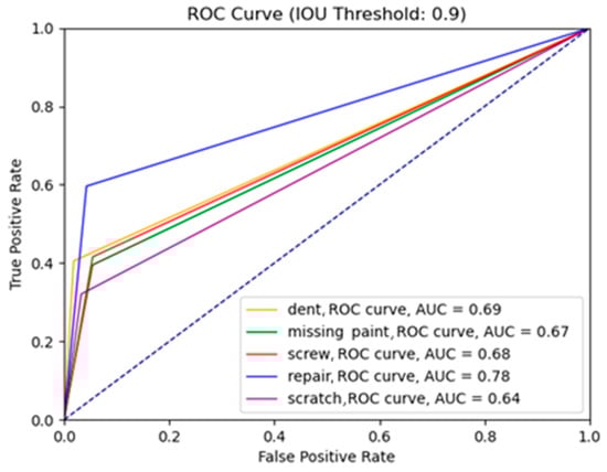 The ROC curve and its associated AUC score offer an alternative method to assess the performance of the model for each class. Similar to the precision–recall curve, the IOU threshold remained fixed at 0.9, indicating a strict requirement for proximity between the ground-truth bounding box and the predicted bounding box to validate a prediction. In contrast to the PR curve, the ROC curve displays slight variations in the performance of each class. This discrepancy arises from consideration of both negative and positive instances, unlike the PR curve, which solely focuses on positive instances. Consequently, the PR curve proves more suitable for evaluating an imbalanced dataset, such as the one utilised in our experiment.