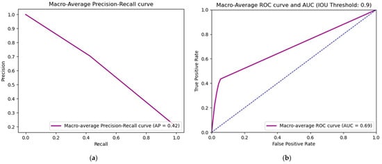 Average metric curves for the best performing model: (a) macro-average PR curve; (b) macro-average ROC and AUC at IOU threshold 0.9.