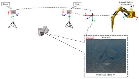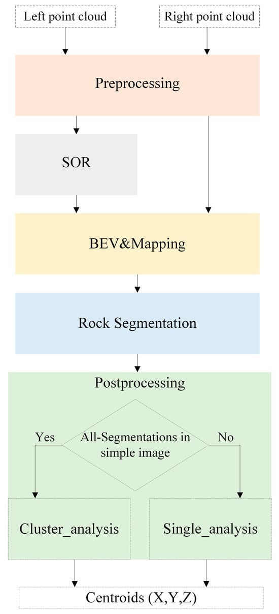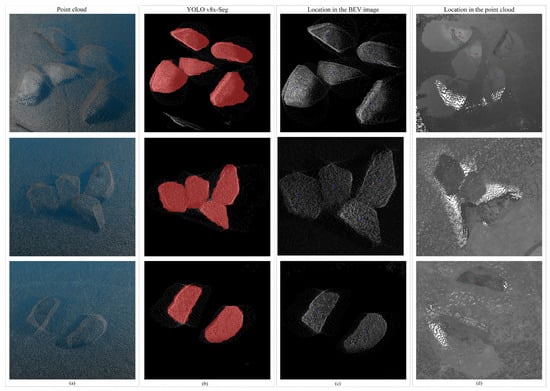 Real-time three-dimensional (3D) rock detection has emerged as an effective approach for information processing in mining environments. Numerous studies have explored and leveraged these technologies in various mining contexts. For instance, ref. [] evaluated the performance and robustness of clustering methods for object recognition during the secondary breaking phase in mining, utilizing Low-Cost Time-of-Flight (ToF) cameras. This research proposed an algorithmic method to efficiently utilize existing clustering and segmentation techniques in the detection loop, determining optimal contact points and approach angles for hydraulic hammers. An autonomous rock-breaking system featuring a Visual Perception System (VPS) capable of real-time detection of multiple irregularly shaped rocks was presented in []. Employing a stereo camera and an industrial manipulator, the system achieved an average success rate of 34% and a breaking rate of 3.3 attempts per minute in a real experimental environment. Furthermore, ref. [] introduced a system for automatically determining target poses for rock breaking in underground mines, utilizing sensor data comprising point clouds and images to segment rocks and generate and evaluate candidate target poses.