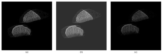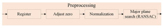 Point cloud registration plays a crucial role in reconstructing the complete shape of 3D objects, as 3D information is typically acquired from multiple viewpoints and requires alignment to consolidate these point clouds. The Iterative Closest Point (ICP) algorithm, a classic registration method described in [], necessitates an appropriate initial position and high overlap rate to yield optimal results []. To enhance the alignment quality, several studies [,,] have employed a two-step approach: first performing approximate registration, followed by fine registration. Approximate registration commonly utilizes shared points, lines, or surfaces within point clouds [,,]. Among these methods, point-based approximate registration is widely adopted due to its speed and simplicity.