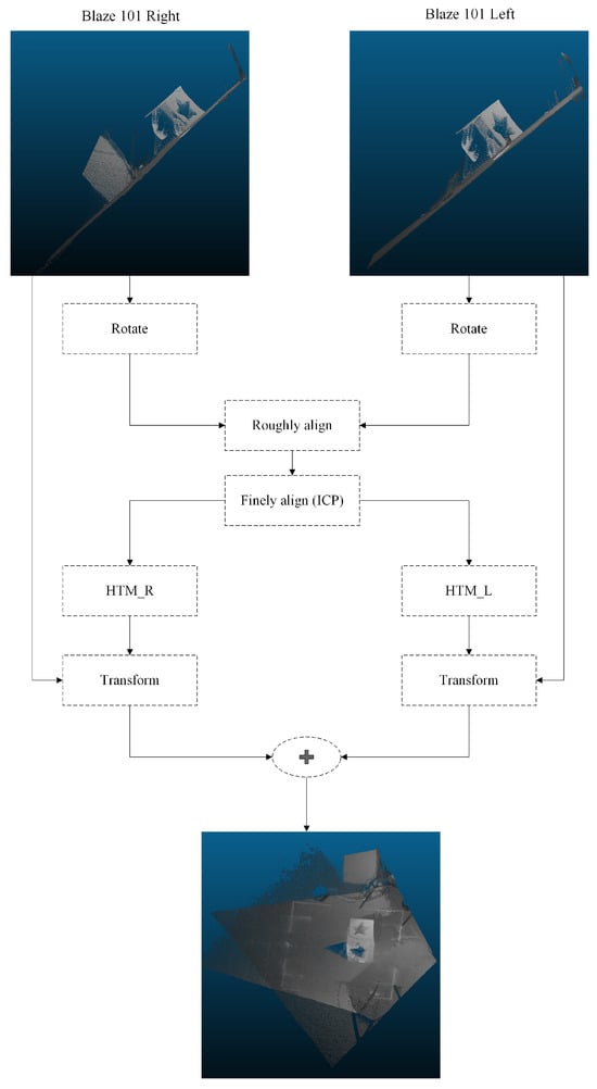 To achieve precise alignment, the ICP algorithm is employed. This algorithm initiates with two point clouds and an initial estimate for rigid body transformation. It then iteratively refines the transformation by generating corresponding point pairs in the point clouds and minimizing the error metric []. In this study, the initial estimate was derived from the approximate registration process.