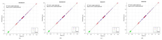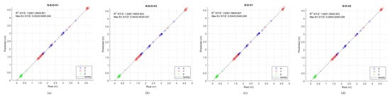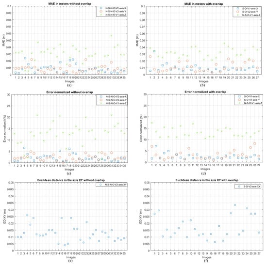 Figure 18 reveals a slight performance degradation compared to the cases without overlapping, especially in the Z axis. However, the results remain robust, with  values for X and Y close to 1 and relatively low maximum errors.