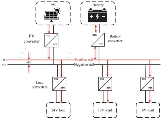 The novel nanogrid architecture the authors developed for this article is shown in Figure 1. The PV converter connects the PV modules to the DC grid, while bidirectional battery converters and load converters link lithium-ion (Li-ion) batteries and various loads to the grid. Among the low voltage levels (12 V to 100 V), 48 V is identified as the optimal choice based on cost and performance. The nanogrid design is scalable; additional PV modules and interface converters can be added to the bus to increase generation capacity. Similarly, extra batteries can be integrated using additional battery converters to support increased loads or storage needs. The EMS can manage variations in DC load and weather conditions, enhancing the system’s modularity and adaptability.