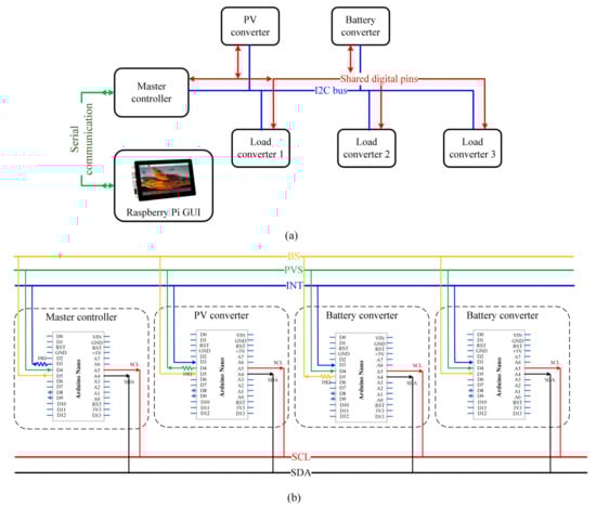In this modular open-source DC nanogrid system, a hybrid control technique is used to implement the EMS. Converters manage source and load-level control, while a dedicated central controller coordinates each unit, as shown in Figure 2. Communication between the units and the central controller occurs through two methods. Critical information is shared via the digital pins of the Arduino microcontroller, with specific pins dedicated to the PV controller and the battery converter to indicate their modes, and the other is for the master controller to manage all units. Additionally, the master controller connects to all converters using an I2C (Inter Integrated Circuit) path, which is a two-wire serial communication protocol using a serial data line and a serial clock line. This allows the central controller to collect local information cyclically and to interrupt, control, or send commands to each converter as needed [43]. This hybrid approach delivers a powerful and fast control system with enhanced resilience to failure.