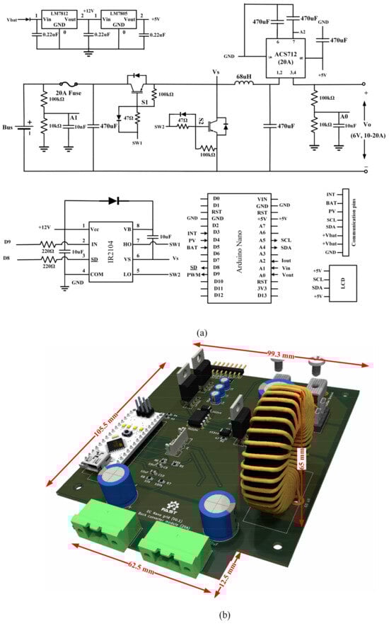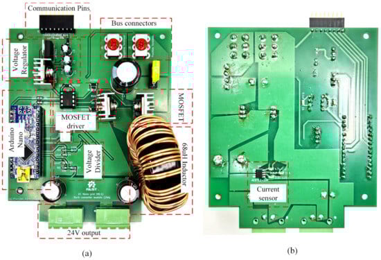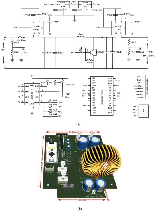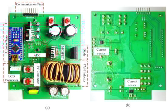 The PV converter operates in two different modes based on the BS signal provided by the battery. When the battery is in the constant current (CC) mode, the PV operates in the MPPT mode. The rest of the time, it operates in the bus control mode. The components and the assembled boost converter are shown in Figure 9.